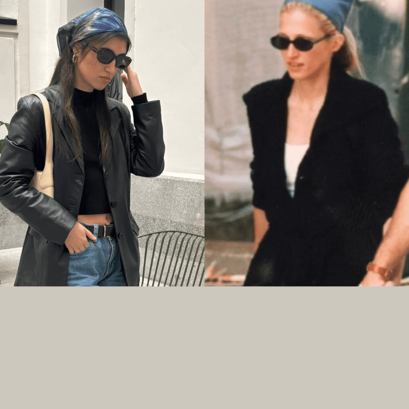 El jueves eligió uno de los looks más famosos de Carolyn: camiseta negra, falda lápiz en tono camel y botas marrones, el conjunto con el que salió tras su boda. Aunque no tenía la falda exacta, usó una similar en vichy marrón y botines de charol. El viernes cerró con vaqueros rectos Calvin Klein, una americana de cuero, jersey negro y el toque final: un pañuelo de flores anudado en la cabeza. Este último *outfit* fue el más celebrado, incluso coincidió con una compañera de otra revista vestida de forma idéntica. “Dime que estás viendo *Love Story* sin decirme que estás viendo *Love Story*”, comentó.